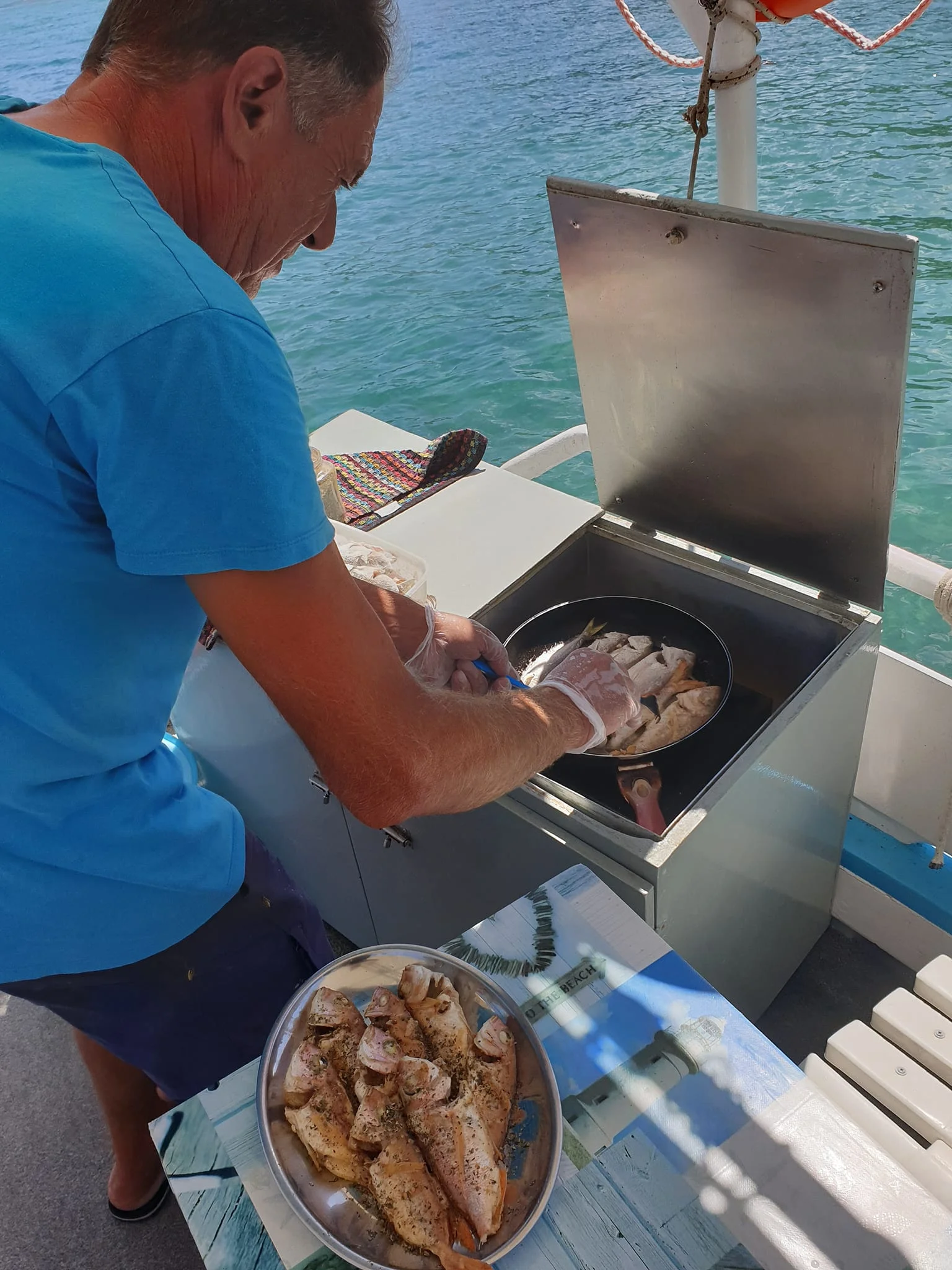 Relax as the crew prepares a delicious meal featuring your freshly caught fish, served with salad, bread, and drinks.