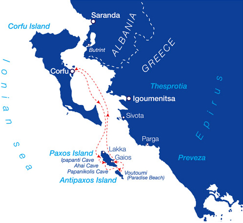 Sail along the west coast of Paxos, visiting the Blue Caves (Ipapanti and Ahai).